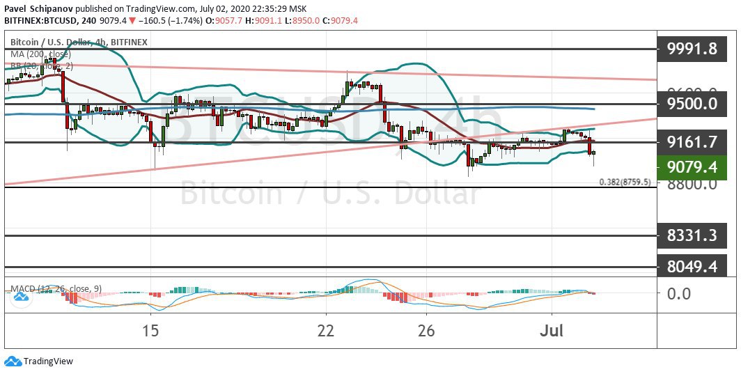 На четырехчасовом графике биткоина сформировалась идеальная модель теханализа «Треугольник». Ретест нижней линии данной фигуры указывает на возможность снижения котировок BTC в краткосрочной перспективе. Закрепление цены ниже линии поддержки на уровне $9150 станет сигналом для последовательного падения к $9000 и $8760 (38.2% коррекция по уровням Фибоначчи). При условии сохранения медвежьего импульса котировки первой криптовалюты могут продолжить падение и далее к поддержкам $8330 и $8050.
