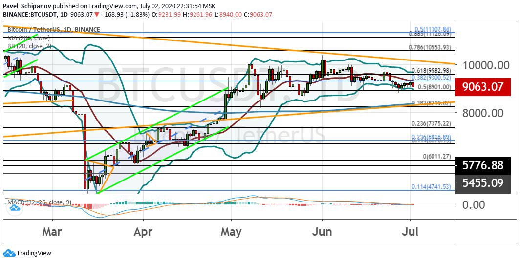 На дневном графике биткоин ожидаемо вышел за границы консолидации $9300−$9580, что привело к достижению цели $8900 (50% коррекции по уровням Фибоначчи). Прорыв этой линии поддержки выглядит наиболее вероятным сценарием, который будет реализован в предстоящие недели. В таком случае первой целью выступит отметка $8220, где проходит линия 200-дневной скользящей средней (MA) и нижняя граница модели теханализа «Треугольник» (ее грани отмечены на графике ниже оранжевым цветом). В этом районе киты начнут набирать позиции, что в долгосрочной перспективе позволит котировкам BTC отправиться вверх к первым целевым уровням $10 000 и $10 500. В рамках 2020 года вероятно также будут достигнуты цели на уровнях $11 000, $11 200−$11 300 и $11 800, но также сохраняется вероятность ухода и выше них.