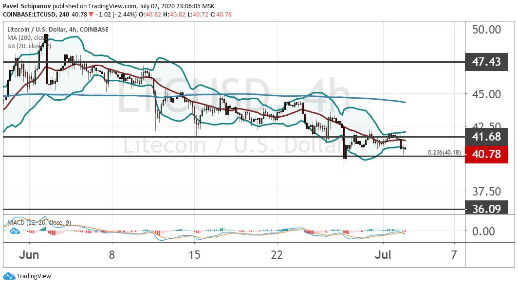 На четырехчасовом графике видно, как котировки лайткоина продолжают движение в рамках кластера $40−$42. Спекулятивная идея с отскоком стоимости LTC к отметке $42 на фоне сформировавшейся бычьей дивергенции и осциллятора MACD полностью себя реализовала. Уход ниже уровня $40 и его ретест станут подтверждениями сценария с обвалом котировок к отметкам $36 и $30.60. Идею о переломе тренда на восходящее движение подтвердит прорыв линии 200-дневной MA, проходящей чуть ниже $45. Первой целью для роста выступит отметка $47.45, а ее прорыв даст импульс для последовательного повышения к $52 (38.2% коррекционный уровень по линиям Фибоначчи), $56.80, $60.80, $65 и $70.