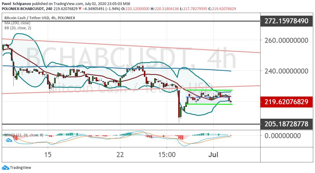 Bitcoin Cash после пробоя и ретеста границ модели теханализа «Треугольник» (ее границы на графике ниже обозначены розовыми линиями) формирует на младших таймфреймах новую фигуру «Канал», которая расположена в диапазоне $220−$230 (ее грани выделены салатовыми линиями).