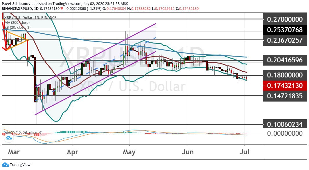 XRP уверенно закрепляется ниже поддержки на уровне $0.18, который также выступает сопротивлением. Остается актуальной торговая идея по снижению котировок альткоина в район целей $0.16 и $0.1470, которые выступают отличными возможностями для набора позиций китами. Потенциально котировки XRP могут уйти к нижней границе консолидации $0.2050−$0.2360, где проходит линия 200-дневной MA. В долгосрочной перспективе прорыв этих границ станет подтверждением сценария на рост котировок XRP к целевым уровням $0.2540, $0.27, $0.2860 и $0.30. Также стоит обратить внимание на возможное формирование бычьей модели теханализа «Двойное дно».