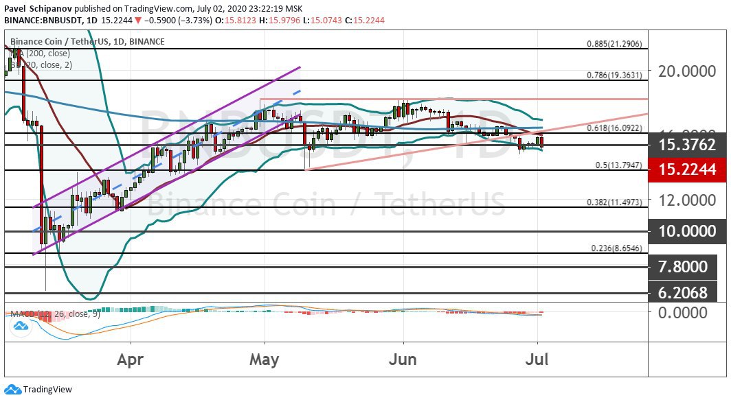 Котировки Binance Coin пробили нижнюю границу модели теханализа «Восходящий треугольник» и после ретеста готовятся к снижению в район $13.80 и $11.50. Дополнительным подтверждением для этой идеи станет уход ниже границ области $15.30−$16, где проходит линия 200-дневной SMA. Это служит сигналом о силе медвежьего тренда.