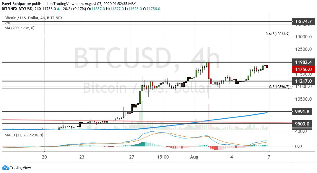 На четырехчасовом графике биткоин был готов подняться до отметки $12 000, но отскочил от нее обратно до важного уровня поддержки $10 800 (50% коррекция по уровням Фибоначчи). Данный уровень также входит в консолидацию $10 800−$11 300. С точки зрения теханализа, котировки BTC будут готовы устремиться к среднесрочным целям $13 000, $13 600 и $14 000 при условии, что первая криптовалюта сможет закрепиться выше $12 000.