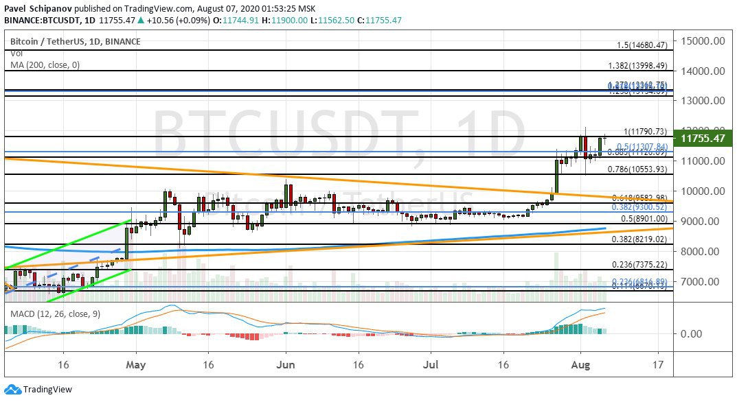 На дневном графике биткоина можно отметить уверенный прорыв границ графической модели «Треугольник» (на графике ниже ее грани отмечены оранжевым цветом). С точки зрения теханализа, котировки еще не исчерпали свой потенциал для роста. В случае закрепления дневных свеч выше текущего сопротивления на уровне $11 800, биткоин потенциально может отправиться к цели $12 500, и далее к кластеру $13 100−$13 350, после которого первой криптовалюте необходимо будет преодолеть отметку $14 000, чтобы протестировать нижнюю границу консолидации $14 680−$15 000.