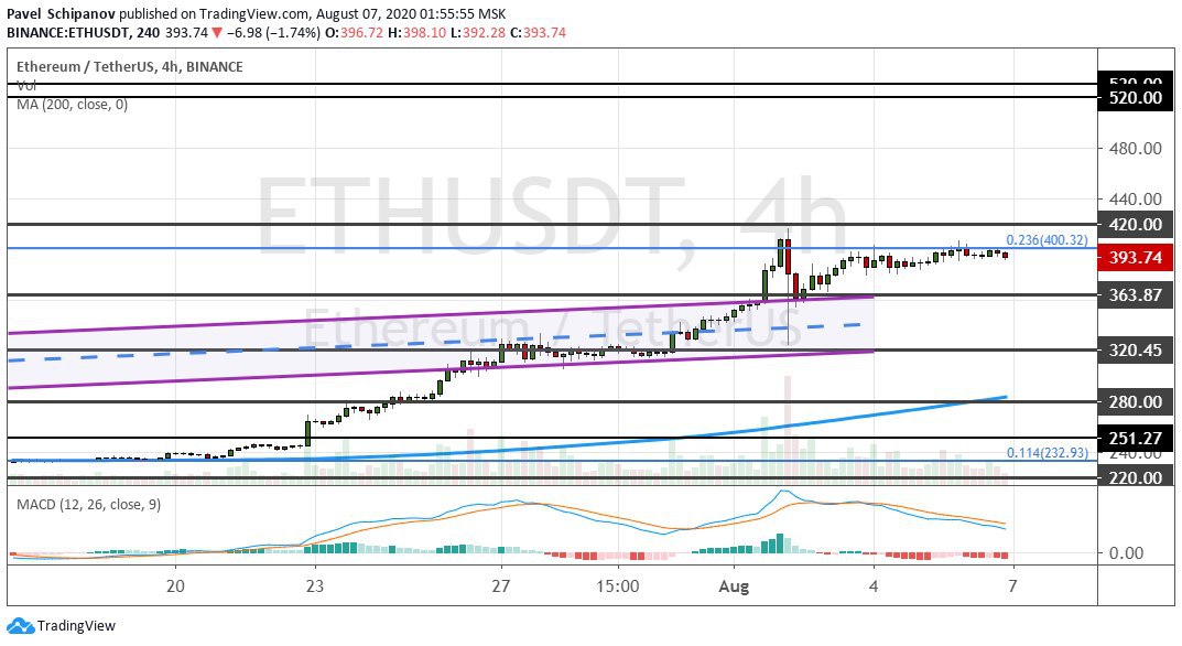 В долгосрочной перспективе потенциал роста эфира еще не исчерпан. Котировки ETH готовы устремиться к целям на $480 и к кластеру $520−$530, однако перед этим они должны пробить верхнюю границу консолидации $400−$420.