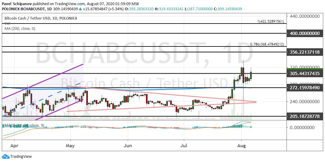 Bitcoin Cash развивает бычий сценарий торгов, в рамках которого формируется ценовая модель «Треугольник» (на графике ниже ее границы обозначены розовыми линиями). Выход вверх за рамки текущей консолидации $272−$305 позволит BCH в предстоящие месяцы достичь кластеров $356−$368 и $400−$420.