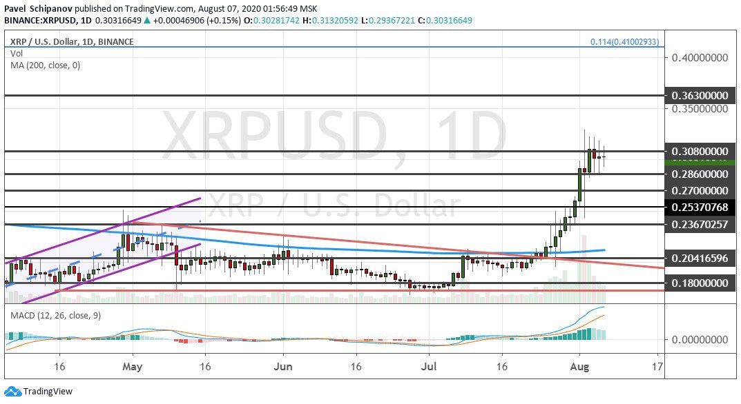 XRP, как и другие активы рынка альткоинов, готов к стремительному взлету после выхода за рамки модели теханализа «Нисходящий треугольник». Это позволило XRP достичь целей $0.27, $0.2860 и $0.3080. Закрытие выше последней позволит котировкам альткоина в перспективе предстоящих месяцев достичь $0.32, $0.36 и кластера $0.40−$0.41. Хотя предварительно возможна коррекция к поддержкам $0.2360, $0.2540, $0.27 и $0.2860.