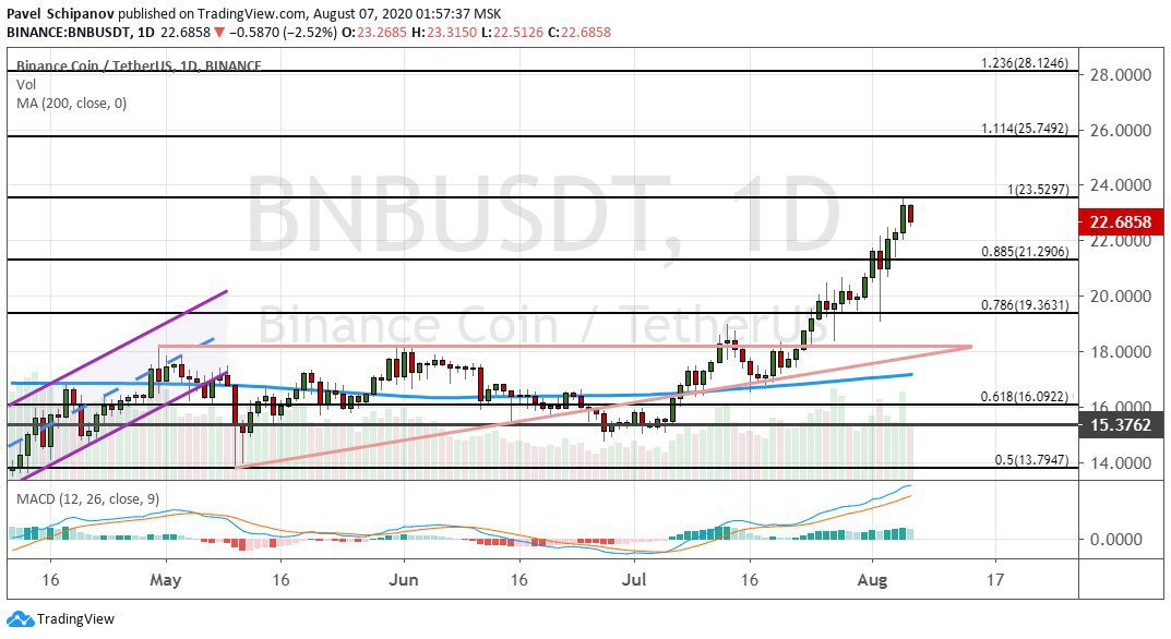 Котировки Binance Coin также успешно развивают бычий прогноз. После ухода за рамки верхней границы модели «Восходящий треугольник» и выше уровня $18.14 BNB смог достичь кластера $19.36−$20 и далее отправиться на покорение целей $21.30 и $23.50.