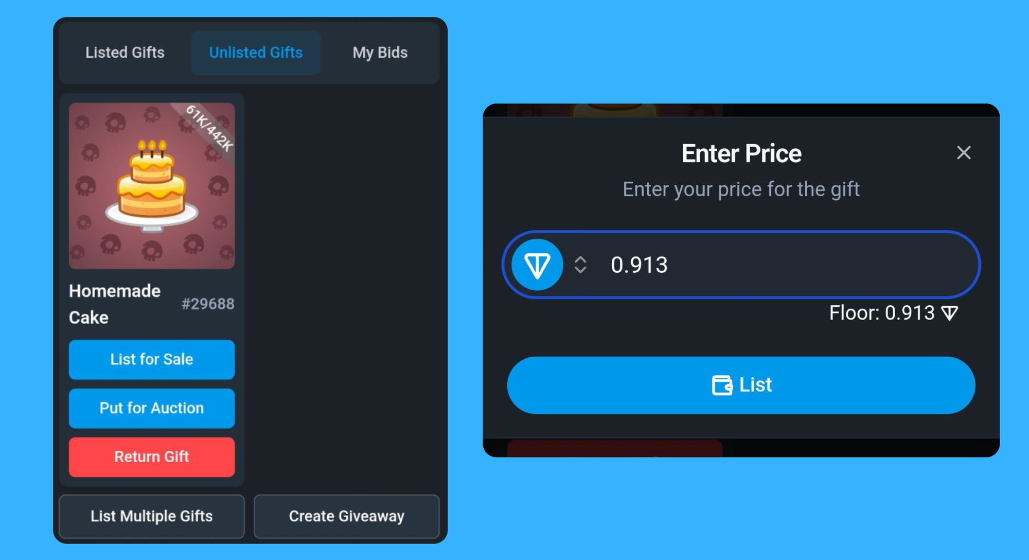 /gift, затем нажмите "List Gift", или просто перейдите в Mini App, выберите подарок и нажмите "List for sale". - Выберите подарок и укажите цену в TON, например, 0.9 TON.