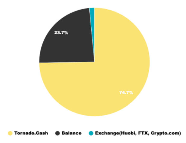 Всего через Tornado Cash в 2022 году было пропущено 300 160 ETH, что составляет 74.7% от общего количества преступных средств, еще 23.7% (95 570 ETH) остаются на кошельках хакеров, и лишь 1.5% (6 250 ETH) были направлены на централизованные биржи Huobi, FTX и Crypto.com: