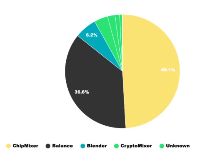 Если говорить о BTC, то 49.1% (2586 BTC) отмытых средств прошло через ChipMixer, 6.2% отмыли через Blender, 3.8% — через CryptoMixer. Еще около 36.6% (2 586 BTC) мошеннических BTC остались на адресах злоумышленников: