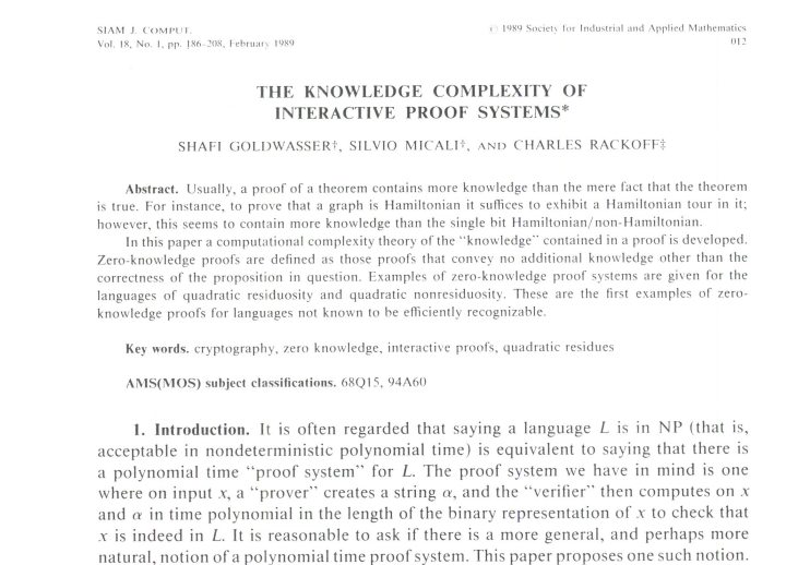 Концепция доказательства с нулевым разглашением была впервые представлена в статье 1985 года, написанной Шафи Голдвассер, Сильвио Микали и Чарльзом Ракоффом: