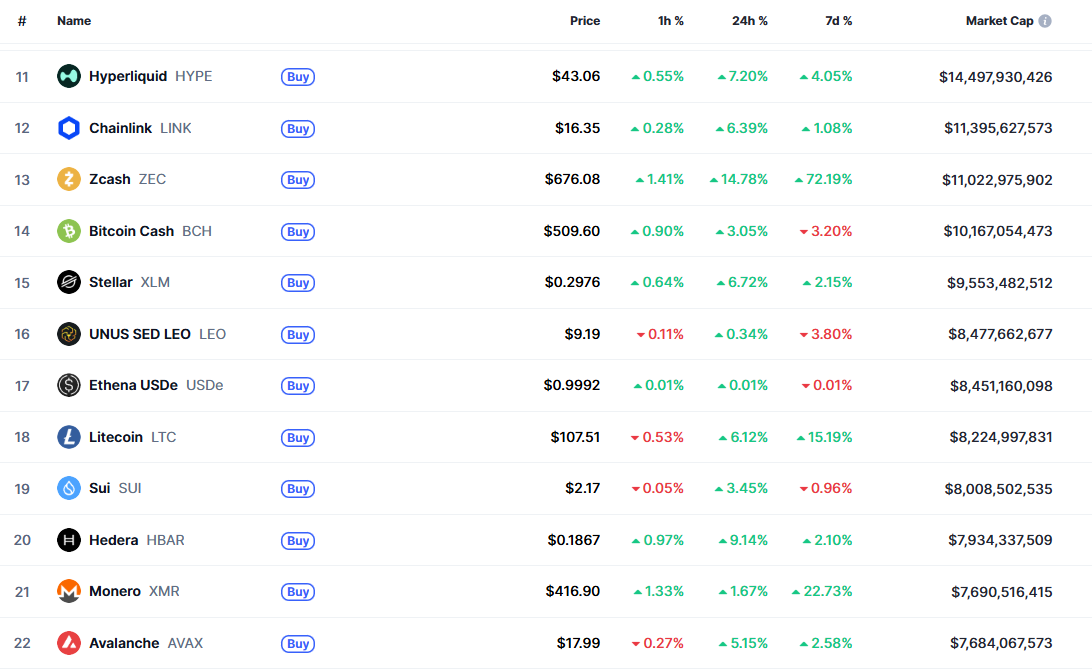 - Рыночная капитализация ZEC составила более $11 млрд, что позволило монете обойти Monero (XMR) с показателем $7.5 млрд и занять 13-ю строчку в рейтинге крупнейших на CoinMarketCap: